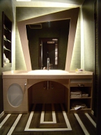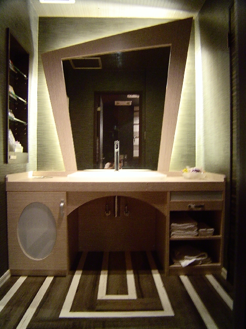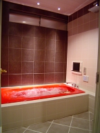 イタリアンレッドカラーが珍しいバスタブと、斬新なデザイン洗面室。