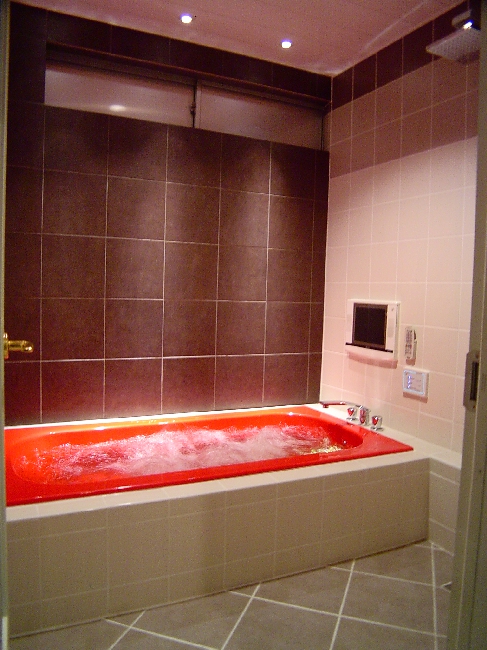 イタリアンレッドカラーが珍しいバスタブと、斬新なデザイン洗面室。